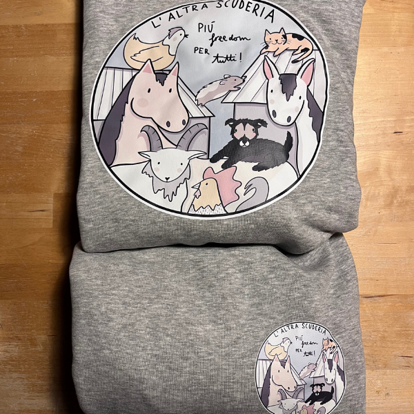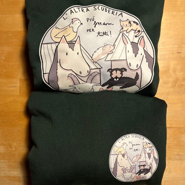 Ogni felpa acquistata sostiene concretamente L’Altra Scuderia e le tante vite che ogni giorno accogliamo e accudiamo, spesso salvandole da situazioni di maltrattamento, abbandono o macello.